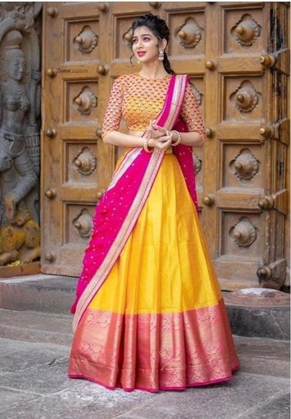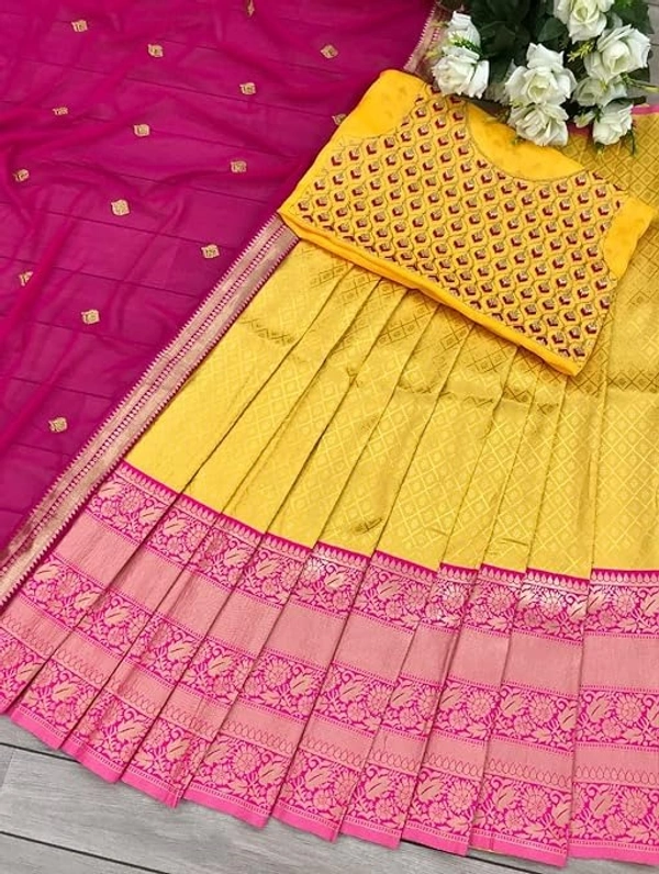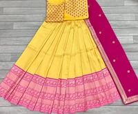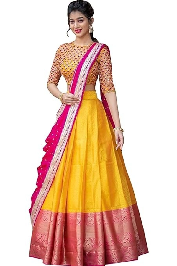 NECWA Women's Traditional Silk Lehegna Choli With Heavy Designer Embroidery Work Blouse Piece And Dupatta Voni Half Saree | Yellow Pink An