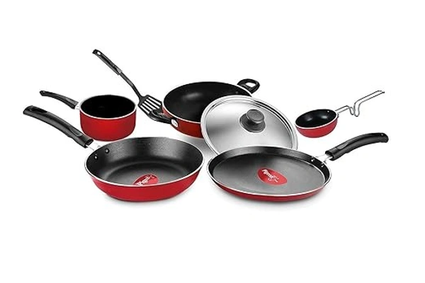 Pigeon by Stoverkraft Non-Stick Cookware Set of 7 Pc w/o Induction Base Includes Nonstick Tawa 23cm, Nonstick Fry Pan 24cm, Nonstick Kadhai with Stainless Steel Lid 24cm, Nonstick Sauce Red, Standard An