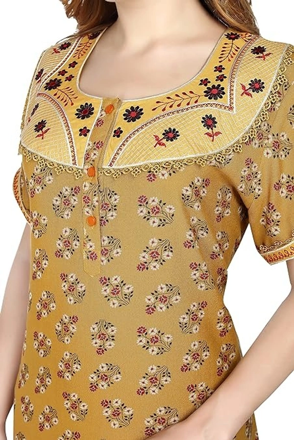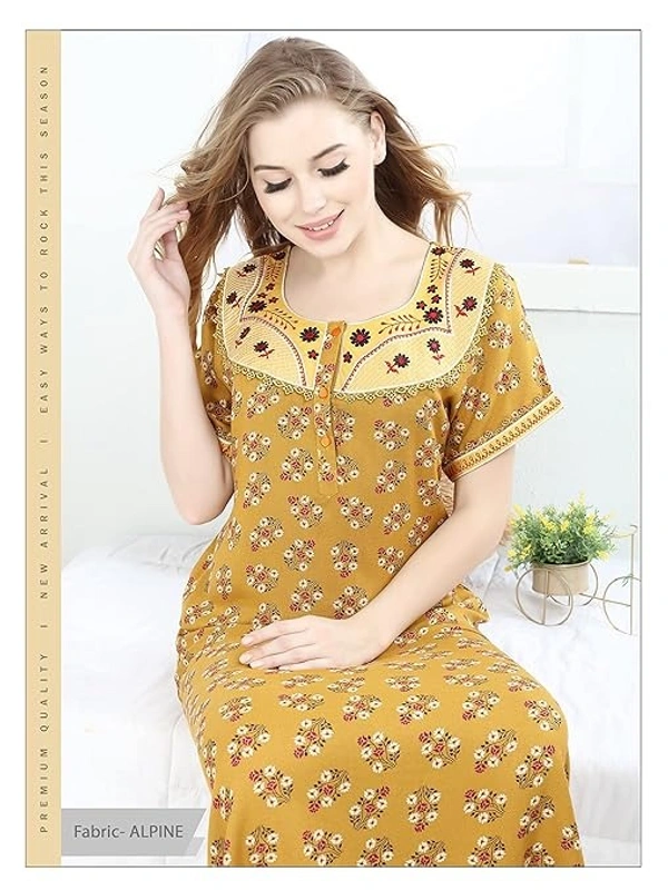 - FIT : Straight fit nightwear for women features a chic and vibrant color and this is what makes it unique and extraordinary. Women's alpine nighty is made from imported materials. Thus, is soft and super comfortable for everyday use. This beautiful maxi has round neck with Embroidery and patch Embroidery at back, half sleeves and has side slip pocket