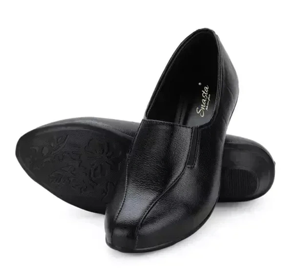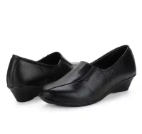These sleek and sophisticated formal ballerina shoes are crafted in a timeless solid black hue. Featuring a closed vamp and a chic pointed toe design, they exude elegance and refinement. The 1.5-inch wedge heel offers both style and comfort, making them perfect for formal occasions. Slip-on adds practicality to their sophisticated appeal. Elevate your ensemble with these versatile and classy ballerina shoes, seamlessly blending fashion and functionality.